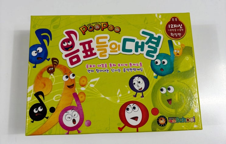 안녕하세요! 오랜만에 재미난 음악 보드게임을 소개 해 볼까 합니다! 저희 원은 매주 목요일마다 피아노 이외에 특강 프로그램이 주 마다 다르게 짜여져 있는데요. 보통 넷째주 목요일에 음악 보드게임이나 음악감상(그림 / 글 로 표현) 등 음악 이외의 예술과목을 결합한 예술융합 시간을 갖고 있습니다. 이번 특강에서 진행한 'poo poo 음표들의 대결' 보드게임은 각각의 힘이 쎈 카드끼리 마주보게 되면 대결을 하여 더 힘이 쎈 카드가 이기며 상대방의 말을 하나씩 물리치며 무지개똥(왕) 카드를 먼저 찾는 사람이 이기는 게임 입니다. 힘이 쎈 카드 순서는 무지개 똥 > 짧은 박 음표 > 긴 박 음표 > 낮은음자리표 > 높....... <img src="https://blogthumb.pstatic.net/MjAyNjAzMDNfMjUx/MDAxNzcyNTE5NjAxNzU3.eUcmIa3ecIF67HwWvdMLNhLHPYkomKSYWLGNi-QGdEog.UwewyMp_4qJD9041k7f0pfILCQg6tsPt7mg8Jnx1JrEg.JPEG/%C0%BD%C7%A5%B5%E9%C0%C7_%B4%EB%B0%E11.jpg?type=s3" />