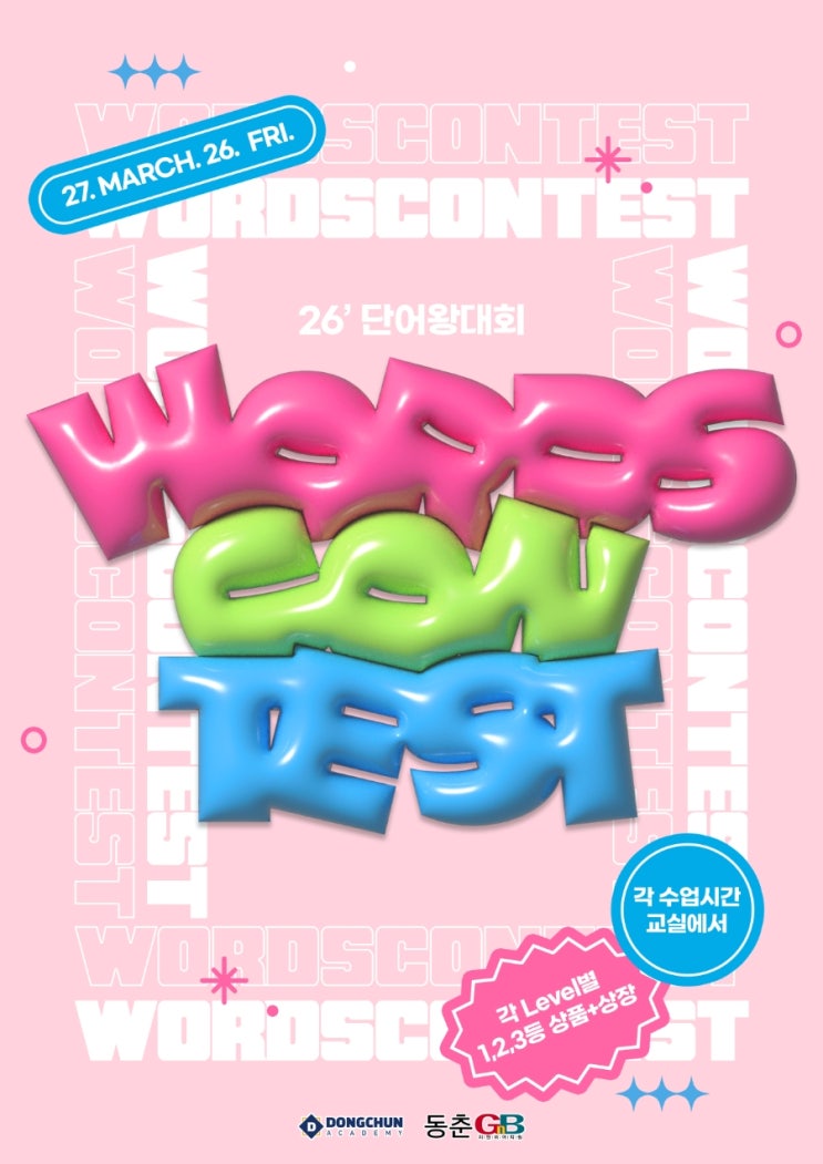안녕하세요. 인천 연수구 동춘동에 위치한 동춘지앤비 영어학원입니다. 새 학기가 시작되는 3월, 학생들의 학습 의욕을 높이고 영어 실력을 한 단계 끌어올리기 위해 단어왕 콘테스트를 진행합니다. 영어! 단어가 전부는 아닙니다. 하지만 단어에 자신이 있다면 다음 스텝은 훨씬 쉬워집니다. 영어 학습에서 문법, 구문,독해, 듣기, 말하기 모두 중요합니다. 그중에서도 어휘력(단어)은 영어 실력의 기본이 되는 중요한 요소입니다. 단어를 많이 알고 있으면 ✔ 지문을 읽는 속도가 빨라지고 ✔ 구문의 의미를 더 정확하게 이해하며 ✔ 영어 자신감도 자연스럽게 올라갑니다. 그래서 동춘지앤비 영어학원에서는 학생들이 재미있게 도전하면서 어....... <img src="https://blogthumb.pstatic.net/MjAyNjAzMTJfNDkg/MDAxNzczMzI3NDkxNzQz.hH8_UETYiYp0mVq7gBiJKWc8pNnUaIVPZOCyu8xuD4wg.sHs361hLBOd4MNOm4N4PPlbCn0nnRO--qR7vvbc84Lwg.JPEG/900%A3%DF1773270517712.jpg?type=s3" />