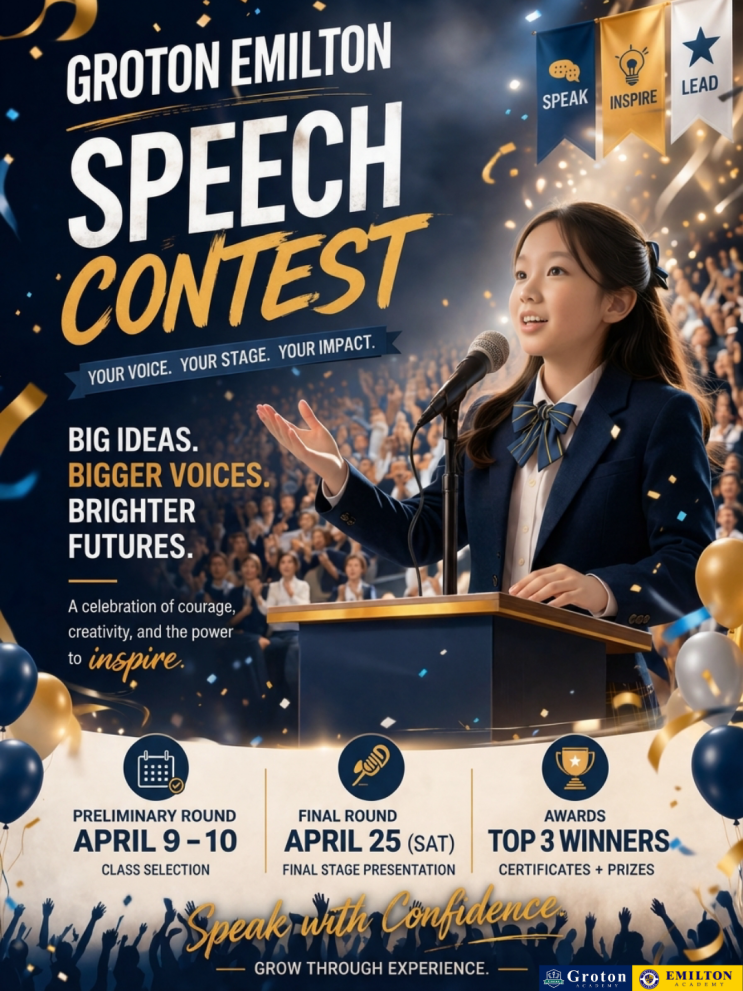 ✨ 2026년 제1회 원내 스피치 대회 ✨ 안녕하세요, 그로튼 에밀튼입니다 아이들의 영어 자신감과 표현력을 한 단계 끌어올릴 Groton Emilton Speech Contest가 진행됩니다. 프로그램 소개 이번 스피치 대회는 단순한 발표가 아닌, 준비 → 연습 → 발표 의 과정을 체계적으로 경험하며 아이들이 한 단계 더 성장할 수 있도록 기획된 프로그램입니다. 진행 방식 ✔ 레벨별 맞춤 스크립트 제공 ✔ 수업 시간 내 충분한 연습 및 피드백 진행 ✔ 부담 없이 참여하며 자신감 향상 중심 학생들이 자연스럽게 영어를 말하고 표현할 수 있도록 체계적인 준비 과정을 제공합니다. 대회 일정 예선 (Preliminary Round) 4월 9....... <img src="https://blogthumb.pstatic.net/MjAyNjA0MDZfODgg/MDAxNzc1NDc0MTQyMjA2.1uTrh6AFx8nJQwEs5wCcc2WGEofMkOCOPSGydILwUSEg.KJuSw5BKoGTMqbXKFgm3kqFIkUY2AogXs_djmfqOo3wg.PNG/KakaoTalk_20260406_174012692.png?type=s3" />