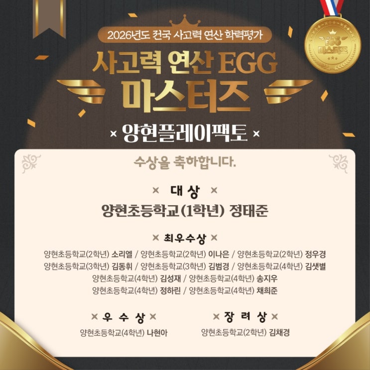 양현플레이팩토의 자랑스러운 결과를 소개합니다! 안녕하세요. 양현플레이팩토 수학교육학원입니다 아이들과 함께 차근차근 쌓아온 노력이 값진 결과로 이어진 기쁜 소식을 전해드립니다. ✨ 2026년도 전국 사고력 연산 학력평가 EGG 마스터즈 수상 결과 ✨ 대상 정*준학생 (양현초 1학년) 최우수상 / 우수상 / 장려상 다수 수상 아이들이 직접 받은 상장과 메달을 들고 환하게 웃는 모습에서 그동안의 노력과 성장이 그대로 느껴졌습니다. 특히 단순히 문제를 많이 푸는 것이 아니라 생각하며 계산하는 힘, 사고력 중심 학습을 꾸준히 해온 결과라 더욱 의미 있는 수상이었습니다. 양현플레이팩토는 ✔ 개념을 깊이 이....... <img src="https://blogthumb.pstatic.net/MjAyNjA0MDdfMTQ4/MDAxNzc1NTI3MzY0MTc1.SFG7zUvqO7uoVXIG0DbkT2ta5mZKDqCWexqnSXezRFkg.gPfa3bs3B8aj-UUzL07OCeHEFfbptXqXIYL9fZSceosg.JPEG/900%A3%DF1775473515615.jpg?type=s3" />