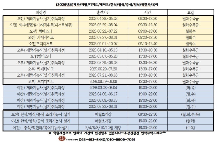 군산 신선생 요리 제과제빵 학원 4월~수업 일정
