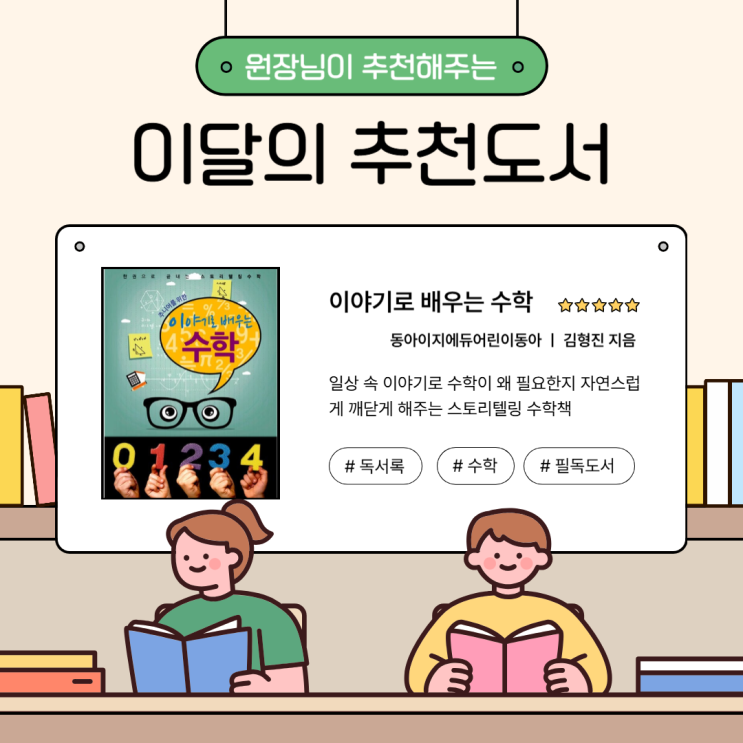 안녕하세요. 생각하는 수학 페르마 방배 캠퍼스입니다. 수학이 어려운 친구에게 꼭 권하고 싶은 책 『이야기로 배우는 수학』은 일상에서 흔히 볼 수 있는 상황을 통해 수학 개념이 왜 필요한지 자연스럽게 알려주는 책이에요. 예를 들면, 놀이공원에서 기다리는 줄을 보며 비율을 이해하고, 과자를 나누며 분수와 배분을 배우게 되는 식이죠. 이야기처럼 읽다 보면 어느새 수학 개념이 머릿속에 쏙! 수학이 어렵게 느껴졌던 아이들에게 편안한 시작점이 되어줄 수 있는 책입니다. 독서록 안내 대상: 『이야기로 배우는 수학』 읽은 학생 분량: A4 1장 내외 제출: 1월 31일까지 / 선착순 2명 편의점 상품권 증정 자유 주제 예시: · 가장 재미있었....... <img src="https://blogthumb.pstatic.net/MjAyNjAxMTVfMjY5/MDAxNzY4NDQ0OTc5MDIz.k_yfDkan_ZdOwX-kNFIjmhhjpbcU9ACcVFKalzdp0_Ug.WMXTv7IpsuzrCtgvAG6RGUhEWqR8FzPZ_HFnBOAH6Fgg.PNG/1%BF%F9_%C3%DF%C3%B5%B5%B5%BC%AD-001.png?type=s3" />
