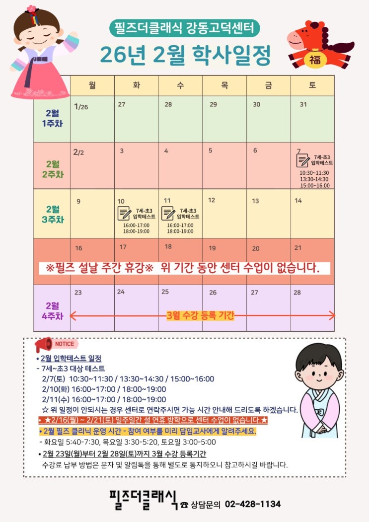 안녕하세요. 필즈더클래식 강동고덕센터입니다 :) 26년 2월 학사일정 안내드립니다. 하나. ★2/16(월)~2/21(토)까지 설 연휴 방학으로 센터 수업이 없습니다.★ 둘. 2월 필즈 클리닉 시간 안내 미리 담임교사에게 참여 여부를 알려주세요. ●화요일 5:40-7:30 ●목요일 3:30-5:20 ●토요일 3:00-5:00 셋. 2월 입학테스트가 7일(토), 10일(화), 11일(수) 진행됩니다. 대상은 2026년 기준 7세 ~ 초3까지 입니다. 2월 입학테스트 신청은 필즈더클래식 홈페이지에서 가능합니다. https://fieldsgood.co.kr/fet/index.php?fc_ccode=F041 상담문의 02.428.1134 <img src="https://blogthumb.pstatic.net/MjAyNjAxMTZfMTMz/MDAxNzY4NTMxOTE2OTQ3.irLqe7dAgSYUAezOsTDI28FTSX9vDaZZ-SX_8rXlfZcg.ZF21-bIlEWTbqMs3CUP5ToFmWYXEDdsmuYlkp9fbJugg.JPEG/2%BF%F9.jpg?type=s3" />
