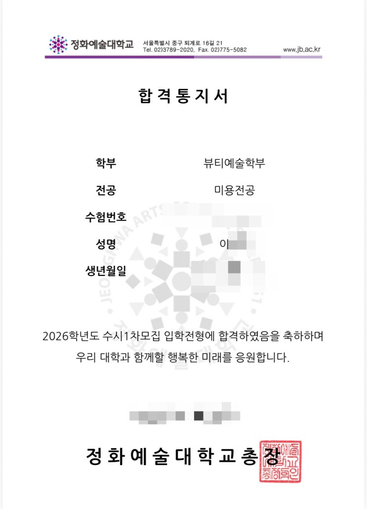 안녕하세요 미용입시 전문교육기관 시크릿뷰티미용학원입니다! 미용을 전공으로 수도권 뷰티과 대학교 진학을 목표로 하고 있다면 이제는 단순히 잘하고 싶다는 마음만으로는 부족한 시대입니다! 정화예대는 -실기 -전공이해도 -관련자격증 -입시준비과정 -포트폴리오 까지 종합적으로 평가하는 학교이기때문에 어떤준비를 , 어디서 ,얼마나 체계적으로 했는지가 합격을 좌우합니다! 구미에서 정화예대 합격을 목표로 하는 학생들이 멀리 수도권이 아닌 시크릿뷰티미용하원을 선택하는 이유 지금부터 하나씩알려드릴게요! 정화예대 입시 , 왜 자격증 가산점이 중요한가요? 정화예대 미용 관련 학과 입시는 단순 실기 점수만으로 결정되지 않습니....... <img src="https://blogthumb.pstatic.net/MjAyNjAxMjlfMzAw/MDAxNzY5NjU0MzEwMTY1.Y2H1sN06QvvlAMdmVRidEMTnlLoXitOV98jyJha9sf8g.3SxN3gwPnAs8185OVNeN-IqttrAmEd7tqQK5jDr2uCIg.JPEG/KakaoTalk_20260129_112901789.jpg?type=s3" />