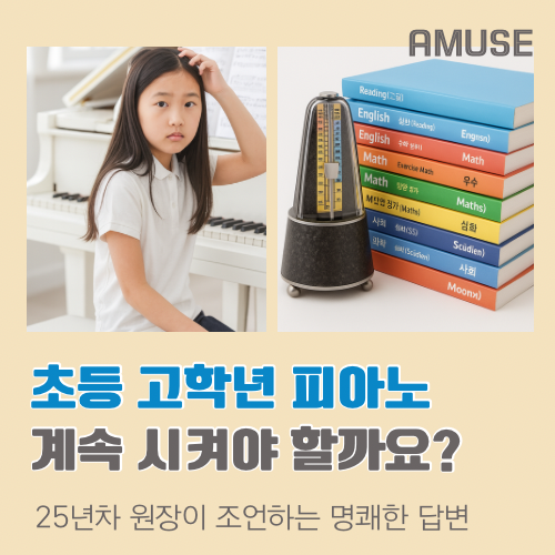 안녕하세요. 달뮤 원장입니다. 초등학교 4~6학년 자녀를 둔 학부모님이라면, 누구나 한 번쯤 이런 고민을 해보셨을 겁니다. 1. 영수 선행에 밀리고, 재미는 잃어가는 '우리 아이 피아노. 수업 시수와 영수 선행 시간을 쪼개서 피아노를 더 시키려니 고민입니다. 아이가 재미없어 하는 것 같고, 체르니 30번을 넘어가니 연습 시간 부족으로 늘지도 않고 정체예요. 막연히 더 시켜야 할까요? 그렇다고 지금 그만두자니, 나중에 악보도 못 보게 될까 봐 너무 걱정돼요. 이 러한 고민은 전공을 목표로 하지 않는 보통의 부모님들이 겪는 가장 현실적인 고민입니다. 걱정 마세요! 25년 교육 경험을 바탕으로, 이 시기 아이들을 위한 가장 현실적....... <img src="https://blogthumb.pstatic.net/MjAyNTExMjlfMjc2/MDAxNzY0Mzg3NzIyNDU5.EBlgErWfJsmicIWWZj2xAJbjMS9E3gHYc4Gtz4sjWsAg.H1VRX57RU2-iIeqMJxcUCCbbCg4z8B_WFoGJr7qBJ8Eg.PNG/Colorful_Playful_Illustrative_Curved_Text_Logo_%A3%AD_1.png?type=s3" />