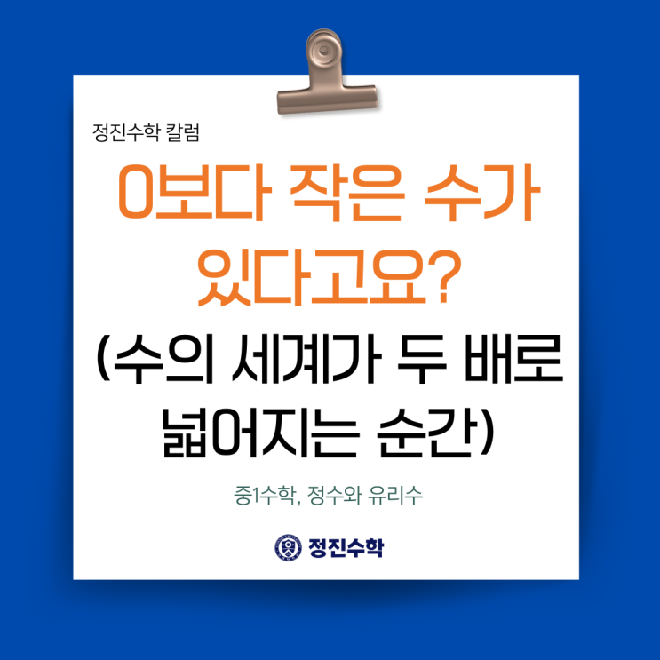 안녕하세요 생각의 깊이가 다른 수학, 세종시 도담동 수학전문 정진수학입니다. 중학교 1학년 수학, 첫 단원인 '소인수분해'는 잘 넘으셨나요? 지금까지는 우리가 익숙한 1, 2, 3...같은 자연수들의 성질을 공부했습니다. 하지만 이제부터는 조금 다릅니다. 초등학교 때까지는 "0이 가장 작은 수"이고, "작은 수에서 큰 수는 뺄 수 없다"고 배웠지만, 이 단원에 들어오면 그 규칙이 깨집니다. 바로 0보다 작은 수, '음수(-)'가 등장하기 때문입니다. 마치 거울 속 세상을 탐험하듯, 수의 세계가 방향을 가지고 확장되는 순간입니다. 오늘 정진수학이 그 새로운 지도를 펼쳐 드립니다. 1. 양수와 음수: 크....... <img src="https://blogthumb.pstatic.net/MjAyNjAyMDZfMjMg/MDAxNzcwMzU0MjIxNTg0.YnZnlBT_gu6GocNmOyaB63ozn9pbJe2J5JZMrY2U5uMg.vDiCEi6UQZxY4YjAsb-KJJ_AlMmYuDATDj9SjLVIi7Ag.PNG/%C1%A4%C1%F8%BC%F6%C7%D0_%C4%AE%B7%B3_-_%C1%A4%BC%F6%BF%CD_%C0%AF%B8%AE%BC%F6.png?type=s3" />