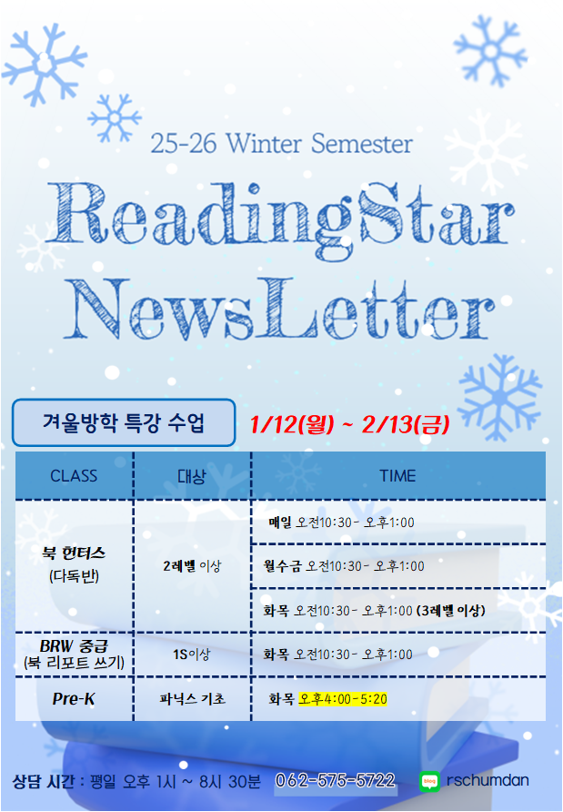 "실력과 인격을 키우는 영어독서" 리딩스타 첨단캠퍼스 안녕하세요~ 리딩스타 첨단캠퍼스는 1Year = 1Grade의 학습목표로 수준별 학습, 균형 있는 정독과 다독을 지도하는 영어독서 전문학원입니다. 25-26 리딩스타 겨울학기 뉴스레터를 안내합니다. 리딩스타에서는 1Year = 1Grade 학습목표 달성을 위해 여름/겨울 방학기간 동안 오전 특강을 실시합니다. 25-26 겨울방학 특강 일정 "2026.1.12(월) ~ 2026.02.13(금)" 오전10:30 - 오후1:00 1. Book Hunters(다독반) 대상: 2Level 이상 요일: *매일반(주5회) *월,수,금(주3회) *화,목(주2회/ 3레벨 이상) 2. BRW(독후감 쓰기반) 대상: 1SLevel 요일: *화,목(주2회....... <img src="https://blogthumb.pstatic.net/MjAyNTExMjFfMTM2/MDAxNzYzNzAxMTU5Njcw._C_iiQEs35e_vtQa6lZVxt37Wk1aHRK-MFC8heDiT9Qg.-9Pc95CXeQ_4O8fSM0yWfk1keYVLsxlklhbl2wMOob0g.PNG/image.png?type=s3" />