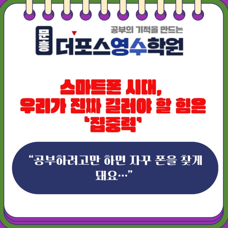 스마트폰 시대, 우리가 진짜 길러야 할 힘은 ‘집중력’ 리 원에서는 중학생들과 함께 스마트폰이 뇌와 집중력에 어떤 영향을 주는지 영상을 보고 이야기를 나누는 시간을 가졌어요. 하지만 이번 시간의 초점은 “핸드폰은 나쁘다!”가 아니었습니다. 오히려 스마트폰이 우리 뇌에 어떤 작용을 하는지 정확히 이해하고, 스스로 스마트폰 사용을 조절할 수 있는 힘— 진짜 집중력을 기르는 것이었습니다. 스마트폰 사용이 집중력을 빼앗는 원리를 알아보았어요. ☆ 짧고 강한 자극이 (도파민 스파이크) → 뇌 피로를 가져오고 SNS, 짧은 영상, 빠른 정보들은 순간적으로 짜릿한 자극을 줍니다. 이 자극이 반복되면 뇌는 점점 ‘빠른 보상’에만 익....... <img src="https://blogthumb.pstatic.net/MjAyNTExMjhfMjk1/MDAxNzY0Mjk0NTYzODE4.-WrfpBaVeE4_Rot29a_6jRJixhbYupvf5hfITthwPoIg.gmbVM1GbPAq2IJPW8ttgaQ-fQjAJSpKmZn462L9Rn88g.JPEG/%BC%AD%BC%FA%C7%FC%BF%A1-%B0%AD%C7%D1-%BE%C6%C0%CC%B5%E9-001.jpg?type=s3" />
