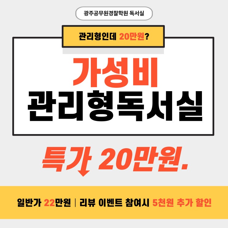 안녕하세요! 광주공무원경찰학원 겨울맞이 한시적 할인행사를 진행합니다. 추운겨울 날씨 탓에 집에서 공부하시려는 분들이 많습니다! 하지만 집에서 공부를 하려고 하면... 금방 삽시간에 흩어지는 집중력! . . . 다가 올 내년 시험을 위해서라도 지금부터는 정말 공부에 전념헤야합니다! 그런 공시생분들을 응원해보고자 한시적으로 대폭 할인 행사를 진행합니다. 【 진행 기간】 25.12.08~12.31 【할인 가격】 ▶ 1개월 20만원 ▶ 3개월 이상 등록시 10% 추가 할인 (*3개월 등록시 6만원 SAVE) ※ 공지사항 선착순 10명 등록 마감 광주공무원경찰학원 독서실 입실대상 광주공무원경찰학원 관리형 독서실 ; 이런 점들이 좋아요! 전대후문 근처....... <img src="https://blogthumb.pstatic.net/MjAyNTEyMDNfMjg3/MDAxNzY0NzIxNDc4NTc5.ppT4zSjwjkhfhsSazIJI5p4Lb2PGhZztSr67azyE0iQg.r2OexV6app1sJpSxX6oEVBYi3dTIbj84AZ2uEZ9_m-8g.JPEG/002.jpg?type=s3" />