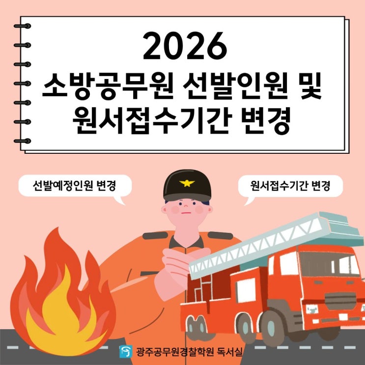 안녕하세요! 전대후문 가성비 관리형독서실 광주공무원경찰학원독서실 입니다! 오늘은 소방공무원 채용인원 및 원수접수기간 변경 안내를 드리려고 합니다! 소방청 공고 파일(제2026-8호) □ 선발예정인원 변경★ □ 원서접수 기간 변경★ ○ 당초 : ʹ26. 2. 2.(월) 10:00~2. 6.(금) 18:00 ○ 변경 : ʹ26. 2. 9.(월) 10:00~2. 13.(금) 18:00 1. 선발예정인원: 2,891명 1) 최종합격자는 최초 임용된 날부터 5년 이내에는 다른 시도로 전보(인사교류 등)가 제한될 수 있음 2) 시험일정, 선발예정인원 등의 변경사항이 있을 경우 소방청누리집 및 국가공무원채용시스템(https://gongmuwon.gosi.kr)을 통하여 재공고합니다. 법령 개정 안내사항 □....... <img src="https://blogthumb.pstatic.net/MjAyNjAxMjhfMjg1/MDAxNzY5NTYyNTUyMzI4.mRlNVceNt5jm_rnA46pI8tsqMsGdyjF7B5QszFbmB98g.KDbWpw33UPGMa0z0bm7JdmUGcHZJqcXHsPZUPpClnZQg.JPEG/2.jpg?type=s3" />