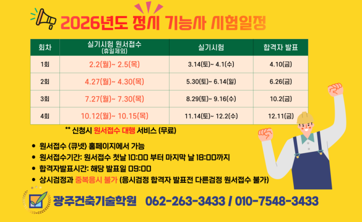 광주건축도장기능사 / 광주방수기능사 취득 전문학원 광주건축기술학원 입니다. 건축도장기능사 / 방수기능사 전문학원 광주건축기술학원 에서는 2026년에 진행되는 첫번째 시험인 기능사 1회 건축도장기능사/방수기능사 자격증 취득 문의로 하루하루를 보내고 있습니다. 2026년도 첫번째 시험!! 1회 기능사 실기시험 1회 원서접수 2월2월(월) ~ 2월5일(목) 큐넷 접수를 서두르셔야 원하는 날짜에 접수 가능!! 문의 주시면 자세한 상담 도와드리겠습니다! 062-263-3433 / 010-7548-3433 오늘은 원서 접수 전 완료해야하는 사항 중 하나! 큐넷 실명인증 과 사진 등록 방법을 쉽게 말씀드리겠습니다. 큐넷(Q-NET) 실명인증 방법!! 1) 큐넷 홈페이지....... <img src="https://blogthumb.pstatic.net/MjAyNjAxMzBfNzMg/MDAxNzY5NzM2Mjg4NTU5.QxhzBVWAohrCpb878wIQ3nU8Og3GbSgl-MJYcLiTunIg.B7BOZM9Evti826Y4tk8FTC4Xegn-rzLGPjFzXgla630g.PNG/%B1%A4%C1%D626%B3%E2%BD%C3%C7%E8%C0%CF%C1%A4.png?type=s3" />