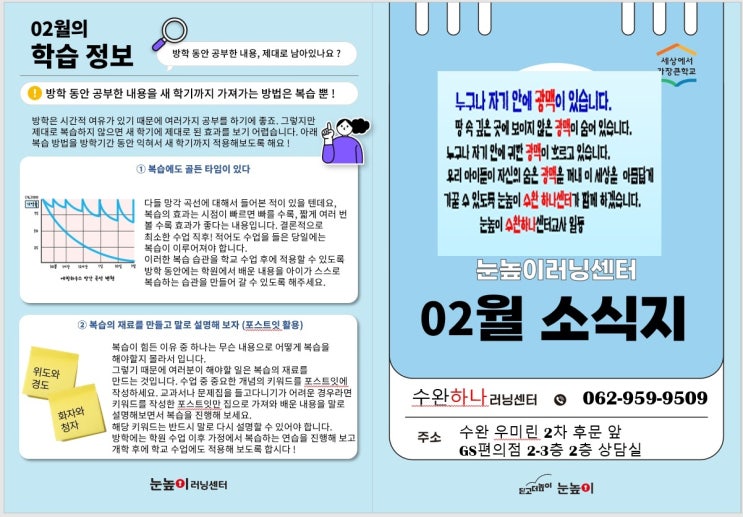 2026년 2월 눈높이 수완하나센터 소식입니다. 2026년 2월 눈높이 수완하나센터 주요일정입니다. 문의사항은 아래 주소로 연락 또는 방문주세요 <img src="https://blogthumb.pstatic.net/MjAyNjAyMTBfMjk2/MDAxNzcwNzE3MzgzNjg4.Hr2WLAs-NQFN01ruOg-lHUvk0Cs93VBSrFm53YYkF-og.RR3__lXNB7X1DuEvujmqOarLFaJbzAuAcWq4Ad2O6LAg.JPEG/1770716849.7802482IMG_0455.jpeg?type=s3" />