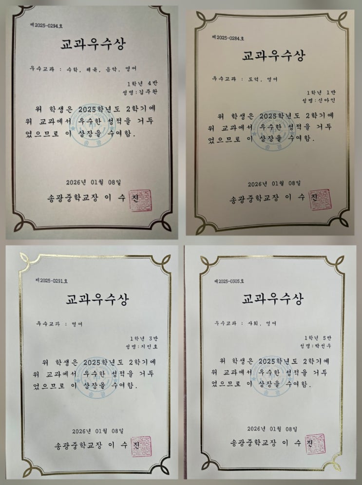 안녕하세요 우리 송광중학교 학생들이 이번 2학기 기말고사에서 정말 멋진 성적을 거두었습니다. 어려운 시험이었음에도 불구하고 당당히 영어 100점과 교과우수상을 휩쓸어온 우리 아이들이 자랑스러운 소식을 전해드립니다.! 결과로 증명하는 압도적 실력! 이번 지필평가는 자유학기제 이후 두번째보는 기말고사 임에도 아이들이 긴장했을 텐테, 결과는 그야말로 대단했습니다. 결과로 증명하는 압도적 실력! ●영어 100점 만점: 총4명 ●95점 이상 고득점: 총5명 ●송광중학교 교과우수상(영어) 다수 수상 (지민호, 김주완, 신아인, 박선우, 채희원, 선은우) 단순히 한 두명의 성적이 잘 나온 것이 아니라, 학급 전반적으로 고득점 상위권을 형....... <img src="https://blogthumb.pstatic.net/MjAyNjAxMjBfMjMg/MDAxNzY4ODM1NjYwOTA5.zrRdiStcveBlrnZM1IsQxeObBVwXXz9JMikKIJyLjhkg.r5bu5ElATjlLEQ-pqigRcF0jL3syXZvVC27KacBzjiEg.JPEG/900%A3%DF20260119%A3%DF231819.jpg?type=s3" />