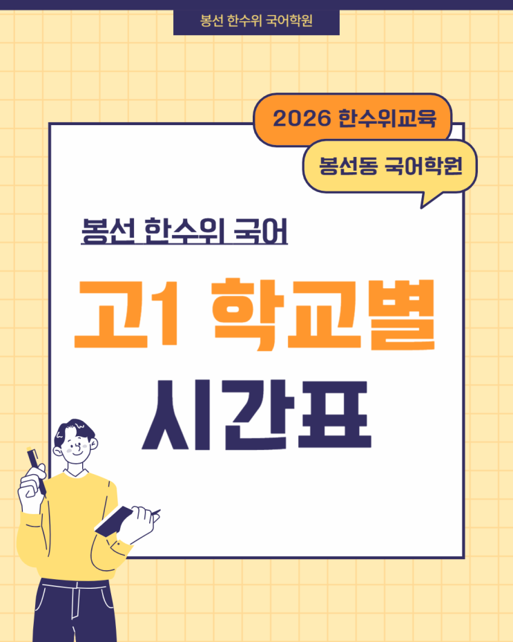 봉선동 국어학원 봉선동 고등국어 제 7133 호 안녕하세요. 봉선동 한수위 국어전문학원입니다. 겨울방학도 어느덧 중반을 지나며, 얼마 전 고등학교 배정이 모두 마무리되었습니다. 이제는 3월을 앞두고 고등학교 학습을 차근차근 준비해야 할 시기에 봉선동 한수위 국어학원의 3월 고1 시간표를 안내드립니다. 고등학교에 입학하는 순간부터 모든 시험은 단순한 평가가 아닌 입시의 기록이 됩니다. 중학교와 달리 고등학교에서는 매 시험 하나하나가 대학 입시에 직접 반영되며 그 결과는 이후 진로 선택과 대학 합격의 중요한 기준이 됩니다. 그럼에도 불구하고 많은 학생들이 “이제 막 고등학생이 되었으니 아직 여유가 있다”는 생각으로 고....... <img src="https://blogthumb.pstatic.net/MjAyNjAxMjlfMTA3/MDAxNzY5NjczNDQ5MDg1.Hg7qPXrcdRh5b0ZEdGnymvBtkqe-93h6rHa69rukCPUg.IMXpoMe2xQlC-Suu5PG47E2TayrVMG0B1C0aRaBEw9Ug.PNG/002.png?type=s3" />