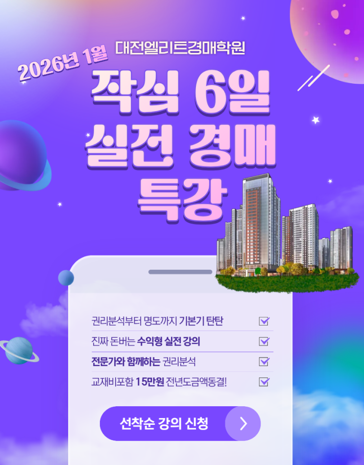 안녕하세요! 대전·세종 부동산 경매의 정석, 엘리트 경매학원입니다. 2026년 새해가 찾아오고 있습니다. ☀️ 여러분, 내년 세우신 재테크 계획 있으신가요? 혹시 작심삼일로 끝나가고 있진 않으신가요? "월급만으로는 부족해..." "나도 월세 꼬박꼬박 들어오는 건물주 되고 싶은데..." 마음은 굴뚝같지만, 막상 '경매'라고 하면 "권리분석? 명도? 너무 어렵고 무서워!" 라고 생각해서 포기하는 분들이 정말 많으세요. 그래서 준비했습니다. 어렵게 1년, 2년 공부하지 마세요. 딱 6일이면 충분합니다. 왕초보도 실전 낙찰까지 가능한 <겨울방학 작심 6일 특강>을 소개합니다! 대전엘리트경매....... <img src="https://blogthumb.pstatic.net/MjAyNTEyMjNfMTA5/MDAxNzY2NDY0OTY4MTQ5.9rNWM_cBmfGqXeP8DQTDf0VqaeO3Prfs8M0e7x_ZqUIg.9SlFQx67hfj3pksY0_-YBh-E3KyG5LjRgfMMYyteLsQg.PNG/1.png?type=s3" />