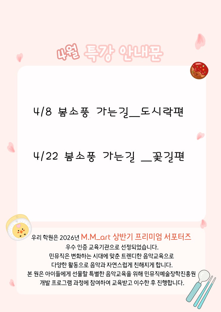 26년 4월 특강 안내드립니다~ 이번 4월은 봄소풍 가는길 ~~ 입니다. 따듯해지는 계절의 분위기에 맞추어 음악 통합활동을 합니다~ 이번달 특강도 기대해~~ <img src="https://blogthumb.pstatic.net/MjAyNjA0MDFfNiAg/MDAxNzc1MDIyNDI0ODYw.US3U6jjCTX9HHnlWAdUqaV2OqGm0HYbggk5bLYkJQD4g.G-apNF1w8vSg_JtPZpacI5N90lnz4FE1R2Y95WYkSGog.JPEG/26%B3%E2_4%BF%F9_%C6%AF%B0%AD.jpg?type=s3" />