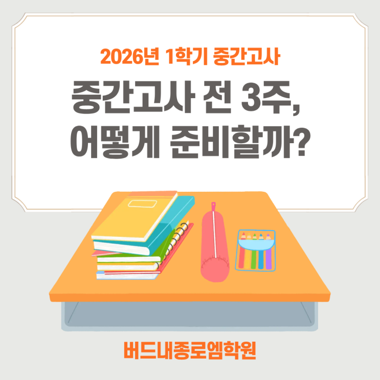 안녕하세요. ✨버드내 종로엠학원✨입니다! 거짓말 같은 4/1 만우절이 지나고 이제 진짜 돌이킬 수 없는 중간고사 시험기간에 돌입했습니다. 학교마다 다르지만, 4월 말에 시작하는 학교가 대부분이니 실질적 대비 기간이 3주 정도 남았다고 볼 수 있죠. 중간고사라니~~! 저는 아직 말하는 감자라고요. ㅠㅠ 그래도 많은 선생님들이 3주면 중간고사를 전략적으로 준비하기 딱 좋은 기간이라고 합니다. 3주가 체계적으로 준비하기 딱 좋다고요~~ 힘을 내세용! 일단 중요한 건 3가지입니다. 1. 무작정 문제만 풀지 말고, 계획을 잡고 공부하기 아직 개념을 제대로 이해하지 않는 상태에서 시험공부한다고 문제은행식 마구잡이로 문제만 푸는 학생은....... <img src="https://blogthumb.pstatic.net/MjAyNjA0MDJfMTM0/MDAxNzc1MTE5MTE4NDg3.mPgq4FX0uMGg9ZLcfqGlehYCF3n0rTDxzmPbhkFb29sg.LH8F1BnvWXtD2YMgdvlMUs1xQiCc3xI5y6ohh3mUtGEg.PNG/20260402.png?type=s3" />