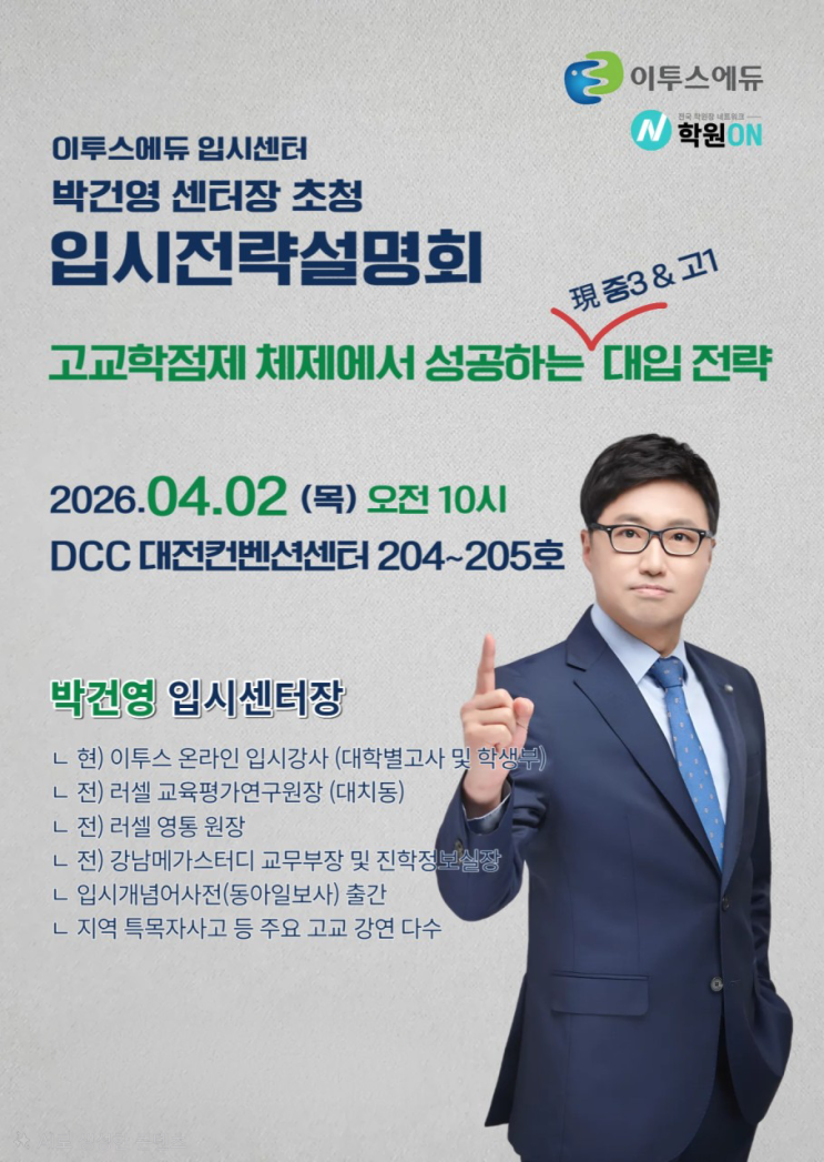 안녕하세요~ 태평동 이룸학원입니다. 4월 2일(목) 10시~12시까지 대전광역시 입시분과협의회에서 주관하여 대전에 소재하고 있는 입시학원원장님 & 학부모님을 모시고 대입전략 입시설명회를 진행하였습니다. [ 설명회 주제 ] 현 중3/고 1 고교학점제 체제 에서 성공하는 대입전략 대한민국 최고의 입시전문가이자 이투스 교육평가연구소장님이신 박건영 센터장님이 강의해주셨습니다! 이번 설명회에서는 아래와 같은 내용을 중심으로 강의가 진행되었습니다 1부. 고교학점제 1년, 숫자가 말하는 변화와 기회 (1) 올해 1등급 비율과 성적분포, 어떻게 읽을 것인가 (2) 5등급 체제, 지원 가능 대학은 어디까지인가 (3) 고교학점제 시대, 대입....... <img src="https://blogthumb.pstatic.net/MjAyNjA0MDJfMTQ3/MDAxNzc1MTE3Mzg5NDU4.5hxUhJbwvYmk3IAiB6Q8mIOl1WH7hTaS-OnjJGaXQyQg.7chrAStfQUo_wWbycshxpgydEZ_xn_1j15uRnqPJvowg.PNG/KakaoTalk_20260311_190946802.png?type=s3" />
