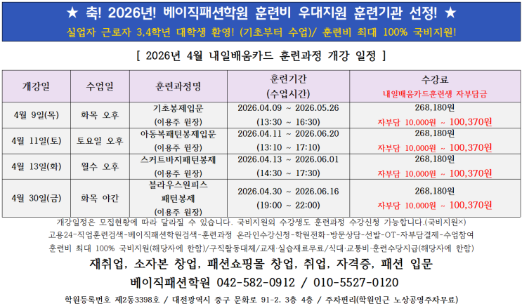 ★ 축! 2026년! 베이직패션학원 훈련비 우대지원 훈련기관 선정! ★ #내일배움카드과정훈련비우대지원 #25년훈련비본인부담은45% ↓ ↓ #26년베이직패션학원본인부담은35% ★ 훈련비 100% ~ 65% 국비지원! ★ ★ 축! 베이직패션학원 훈련비 우대지원 훈련기관 선정! ★ 2026년 #대전패션학원 #베이직패션학원에서 훈련비 우대지원받고 패션전문가로의 첫걸음을 시작해보세요~ 실업자 근로자 일반인 학생 주부 신청 가능 (기초부터 수업)/ 훈련비 최대 100% 국비지원! [ 2026년 4월 개강 일정 안내] ▶기초봉제입문 - 훈련교사: 이용주 원장 - 4월 9일(목) 개강 - 화목 오후 13:30 ~ 16:30 - 2026.04.09 ~ 2026.05.26 - 기초 미싱사용법부터 수선....... <img src="https://blogthumb.pstatic.net/MjAyNjAzMjhfODYg/MDAxNzc0NjgxNDM5NjAy.KxFVEz2tTTtBOBDAf3arRrb3uxNg0OsZGZb4NFwx-Fgg.h4IXK_-j_8FjRatXqRWaFwF55hVZNWvzk77S7TUxYV4g.PNG/2026%B3%E24%BF%F9%B0%FA%C1%A4%B0%B3%B0%AD%C0%CF%C1%A4_2026-03-28.png?type=s3" />