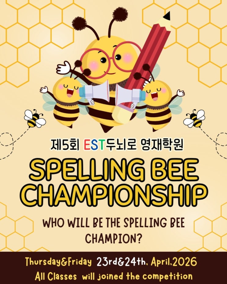 Spelling Bee Competition 안내 4월 23일(목) & 24일(금) 아이들의 도전과 성장을 확인할 수 있는 Spelling Bee Competition이 진행됩니다! ✨ 그동안 쌓아온 실력을 마음껏 발휘하고, 자신감을 키우는 멋진 무대가 되길 기대합니다 일정: 4/23(목) – 4/24(금) 대상: EST students <img src="https://blogthumb.pstatic.net/MjAyNjA0MDZfMTI2/MDAxNzc1NDU0NTI1ODk3.U0ZOV3tMVvYRkkNCP1CHcPjTzJCKmLySnJMgFJoM3sAg.eBPT6ljkPj__yNcnylcKUfg6ODYVDn8h2JK5UFM8uqwg.JPEG/Spelling_Bee_Competition.jpg?type=s3" />