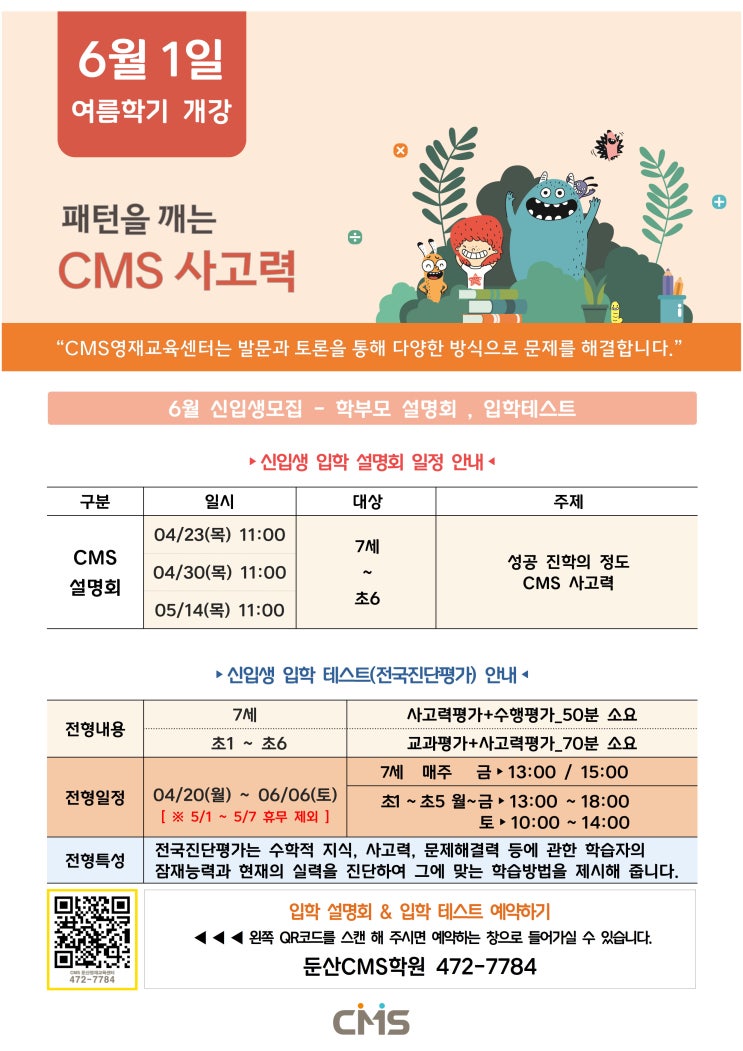 안녕하세요! CMS 대전둔산센터입니다. 여름학기(6~8월 수강) 입학 관련 설명회 및 레벨테스트 안내 입니다. [ 입학 테스트 일정 ] : 04/20(월) ~ 06/05(금) - 평일 오후 1시 ~ 오후 6시 00분 - 토요일 : 전화문의 ( ※ 7세 테스트는 금요일 1시/3시(3명씩)만 예약 가능합니다.) ▶ 진단관련 - 유효기간은 6개월이며, 재시험은 6개월 이후 가능합니다. ▶ 결과 상담 - 1:1 대면 혹은 전화상담 진행되며, 데스크에서 예약 도와드리겠습니다. [ 입학 설명회 일정 ] ▶7세 ~ 6학년 04/23(목) 11:00 04/30(목) 11:00 05/14(목) 11:00 [ 레벨테스트 예약 방법 ] ★ 설명회 및 입학 테스트는 사전 예약 후, 진행됩니다★ ▶ 네이버예약 https://pcmap.pl....... <img src="https://blogthumb.pstatic.net/MjAyNjA0MDZfMjA0/MDAxNzc1NDUwMjE5MjQ2.y-Kr5r4jKe0zrkrD4Ke173Q8yRQQ837mHSvmVRoh4_gg.goKjZaTdclsus6elUKRyBPr1CD4AkxRWiBA8mquu0uQg.JPEG/2026%B3%E2_3%BA%D0%B1%E2%286%BF%F9%29_%C0%D4%C7%D0%BC%B3%B8%ED%C8%B8_%C0%CF%C1%A4%BE%C8%B3%BB_%C6%F7%BD%BA%C5%CD_%C0%A5%BF%EB001.jpg?type=s3" />