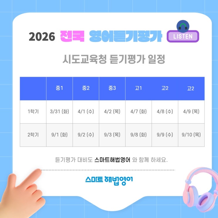 스마트해법영어 강샘수학입니다. 중등영어듣기평가 어떻게 준비해야 할까? 1년에 딱 2번 시행되는 듣기평가 대비를 해두는 과정이 필요해요. 그래서 오늘은 올해 중학교영어듣기평가를 준비하시는 분들을 위해 일정 알려드려요. 전국 16개 시·도 교육청이 공동 주관하는 중학교영어듣기평가는 1년 중에 4월과 9월 단 두 차례에 걸쳐서 진행이 되고 있는데요. 그중에서 1학기 중학교영어듣기평가일정은 3월 31일부터 4월 2일까지로 예상이 됩니다. 일부 학교에서는 이 영어듣기평가 점수가 수행평가 점수로도 5~20% 반영되기 때문에 단순 연습이 아니라 실전 대비가 중요합니다. 기출문제/문제유형 미리 학습하는 과정이 필요해요. 26학년도 중등....... <img src="https://blogthumb.pstatic.net/MjAyNjAzMjNfMTQy/MDAxNzc0MjM4NTQ4NTg2.CZV7uzJrUjYzTNtaTh5jrxcSTpNgF7_uvEqnrDxEZ84g.OfTbHLNSLH93yTywt3D9adVms4wPg5zNLyCQdfDdy4Mg.JPEG/KakaoTalk_20260323_122437432_01.jpg?type=s3" />