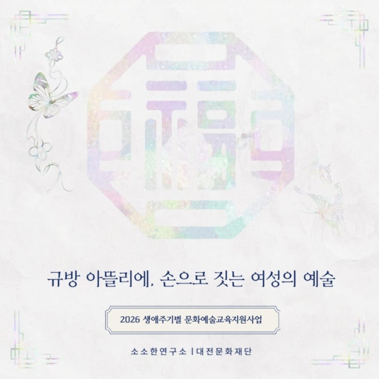 본 교육은 '2026 생애주기별 문화예술교육지원사업'으로 전통공예를 통해 서로 다른 문화와 조각이 하나의 아름다움이 되는 이음의 예술교육 프로그램입니다. - 신청기간: 3. 25~4. 20까지, 신청 및 이체 선착순 - 참가비용: 8만원(교육 종료후 80% 이상 출석 환불) 하나은행 658-910048-04105 (소소한연구소) - 교육대상: 전통공예에 관심있는 중장년 여성, K컬쳐에 관심있는 다문화가정 여성 - 교육기간: 4. 24 ~9. 4(20회) 매주 금요일, 10~12시 - 교육장소: 전통자수연구소 (대전 유성구 노은서로 112번길 70) 피자헛 노은점 근처 - 관련문의: 010-8609-9039 https://forms.gle/JpPENtmUeZAzHUdR9 본 교육은 '2026 생애주기별....... <img src="https://blogthumb.pstatic.net/MjAyNjA0MDRfMjMw/MDAxNzc1Mjc2Mzk5MjAz.qJWv66ZEFg7EPCahEb_p3cCOBA0B2R70nrWdz3NfOPMg.NtlXE9xtv5B3Ysi2yeuZcjxznPCewOyXPCKIDUUlDSkg.JPEG/900%A3%DF1775275903767.jpg?type=s3" />