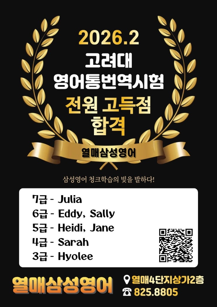 2026년 2월말, 우리 열매 아이들 7명이 고려대 영어통번역시험에 도전했고, 전원 고득점 합격이라는 결과를 만들어냈습니다. 전원 합격보다 더 기쁜 것은 아이들이 '나도 할 수 있다' 는 마음을 얻은 것이지요. 이런 경험이 쌓여 아이들의 영어는 더 단단해지겠지요! 또한 이 결과는 단기간에 만들어진 것이 아니라, 누적된 훈련들이 쌓이고, 수업 시간마다 반복해온 삼성영어의 '청크 기반 문장 훈련' 의 결과라고도 할 수 있지요. 보통 4~5학년 이상, 삼성영어 베이직 B과정 이상을 학습하고 있는 아이들이 시험에 응시를 하게 됩니다. 그리고 늘 단계별 쓰기 과정을 꾸준히 해오고 있는 아이들은 더 가볍게 도전을 하게 되....... <img src="https://blogthumb.pstatic.net/MjAyNjAzMjlfMTk0/MDAxNzc0Nzg0OTI4Mzcw.Em9go8TQCkcCJJQF35UD40s_631Xofh5oB2TCX0l5Hog.yAlPkKm3Z-hR3zHTujCcdZH6aJ58liA3WiIl02nGdrUg.JPEG/1774337329372.jpg?type=s3" />
