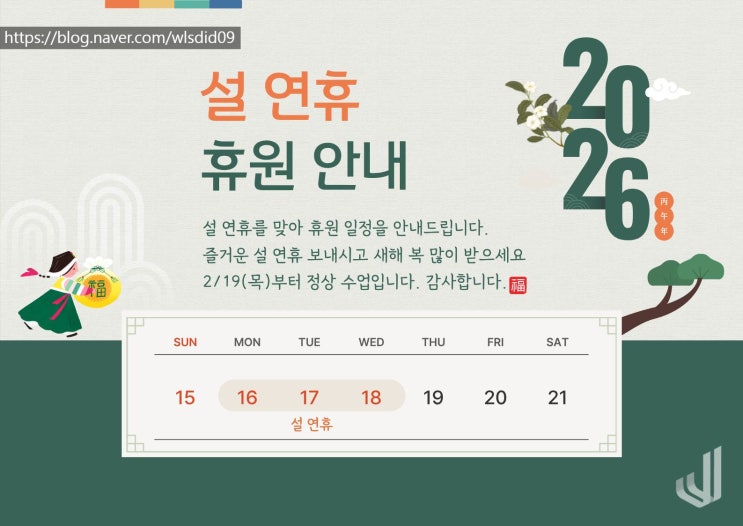 설 연휴를 맞아 휴원일정을 안내드립니다. 2/16(월) ~ 2/18(수) 휴원 2/19(목)부터 정상수업입니다. 즐거운 명절 보내시고 새해 복 많이 받으세요! <img src="https://blogthumb.pstatic.net/MjAyNjAyMTNfMTI1/MDAxNzcwOTczNzc0Mjg1.mlxzGdI-l3rot4LyopPl__RXBwTBj-DrXoCfDQL-mt8g.JbXV8zGElEWmRlrv7PixSy0aqMUs-mwfqM40sXxi790g.JPEG/%C1%A6%B8%F1%C0%BB_%C0%D4%B7%C2%C7%D8%C1%D6%BC%BC%BF%E4._%283%29.jpg?type=s3" />