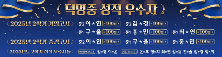 덕명중 성적우수자들 축하합니다!^^ 2025년도 2학기 기말고사 중2 이ㅇ연 100점 중2 김ㅇ경 100점 중1 구ㅇ율 100점 중1 홍ㅇ민 100점 중1 최ㅇ연 100점 2025년 2학기 중간고사 중2 이ㅇ연 100점 중1 구ㅇ율 100점 중1 홍ㅇ민 100점 2025년도 2학기 성적 우수자들 90점 이상 중1- 윤ㅇ후 정ㅇ지 최ㅇ연 김ㅇ원 전ㅇ솔 김ㅇ경 정ㅇ이 중2 - 김ㅇ경 이ㅇ윤 <img src="https://blogthumb.pstatic.net/MjAyNjAxMTRfMTgw/MDAxNzY4MzE4MTcxMDk2.Ufa3JKl9b74jseeDQvGEVYqGxpG2ZqcVQEGyhhtB8uYg.7oY_GW2mu96LUGhNPZsaflPBq5rpeMmPoUq695dPsh8g.PNG/900%A3%DF1768317138907.png?type=s3" />