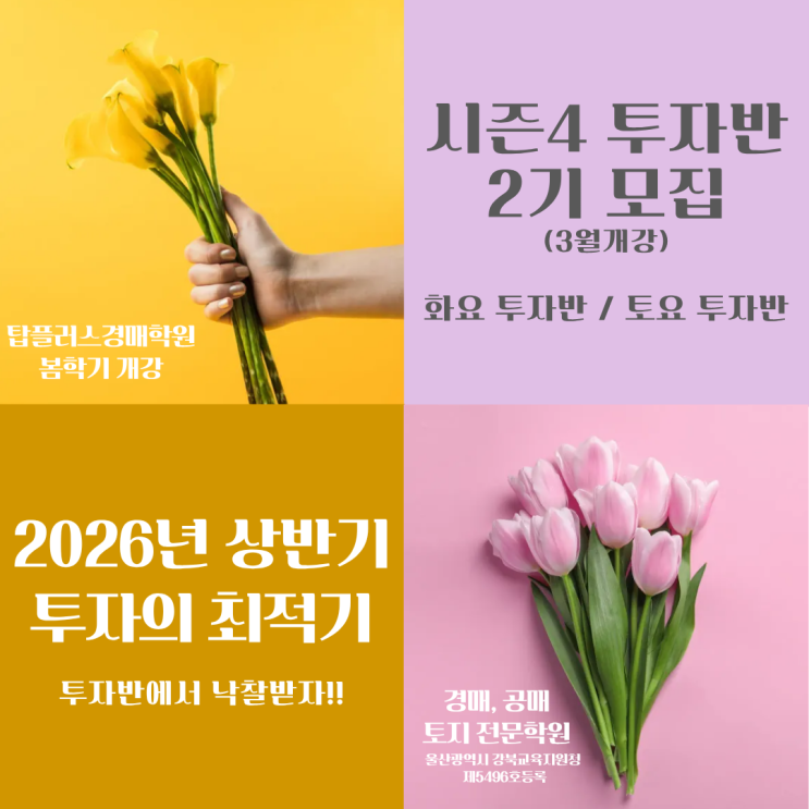 2026년 시즌4 2기 화요투자반 / 토요투자반 모집 안내 새로운 시작 봄학기 경매, 공매 도전 탑플에서 시작하자!! 실전 투자반, 현장답사, 개인투자상담, 출구전략 등...... #탑플러스경매학원 #박동일원장 #봄학기경매투자반 #울산법원경매 #온비드공매 #토지전문경매학원 <img src="https://blogthumb.pstatic.net/MjAyNjAyMDlfMTUg/MDAxNzcwNjEyODQzNTcz.7VGvXtvJd-nbrLEOKKxQRcyX7cQriewHCF0PGEjJkTcg.w_H_JnqZB4uBzWt7KGtV6D6KDl7tO6mQNZBKEIx2o24g.PNG/2323.png?type=s3" />