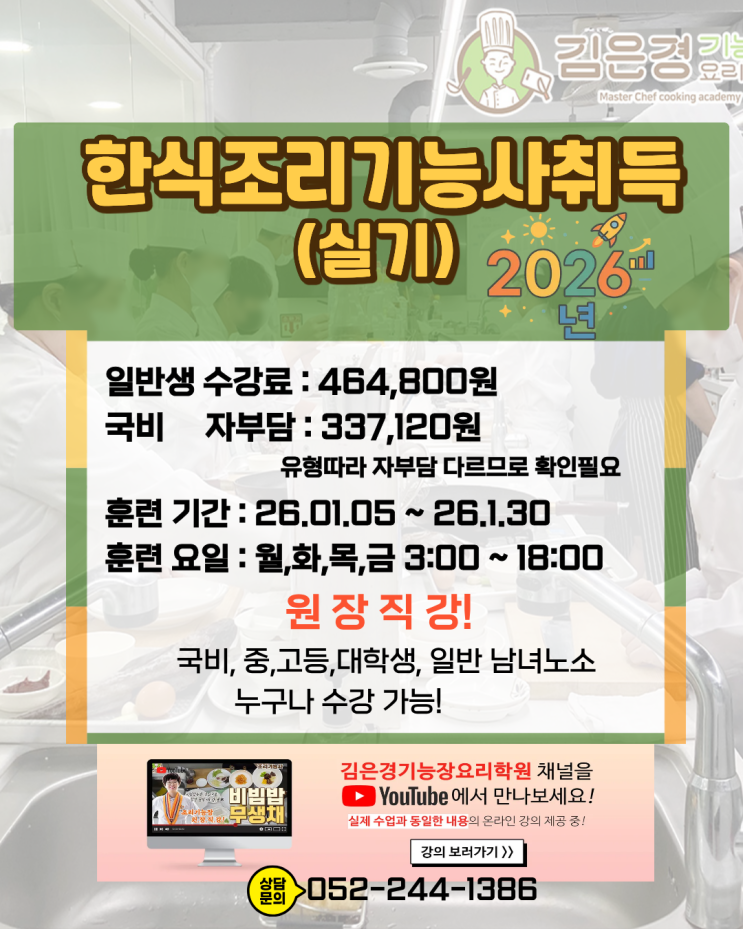 [울산한식요리학원]2026년 1.5오후반 한식조리기능사 취득(실기) 2026년 한식조리기능사 실기 준비, 제대로 시작하세요 기능장 원장 직강으로 합격을 목표로 합니다 한식조리기능사 자격증은 조리과진학, 취업, 창업, 단체급식, 조리사 커리어의 기본이 되는 국가기술자격증입니다. 하지만 실기 시험은 단순히 요리를 잘한다고 해서 합격할 수 있는 시험이 아닙니다. ✔ 제한 시간 ✔ 정확한 조리 순서 ✔ 감점 없는 칼질과 담음새 ✔ 시험 기준에 맞는 완성도 이 모든 것을 시험 기준에 맞춰 훈련해야 합격할 수 있습니다. 김은경 기능장 요리학원이 다른 이유 울산 중구에 위치한 김은경 기능장 요리학원은 기능장 원장이 직접 수업을 진행하며....... <img src="https://blogthumb.pstatic.net/MjAyNTEyMTZfMTk0/MDAxNzY1ODk1OTUyNTM2.Fa1UlBj4HCFL2HbAwb7qy5SDX07apdEg6kfvtN4nW3Mg.3rtSFNxuCI5ZGRRbCm_jGmENeWD_8SLv-pFcMYTkZ2Eg.PNG/%C1%A6%B8%F1%C0%BB_%C0%D4%B7%C2%C7%D8%C1%D6%BC%BC%BF%E4._%2821%29.png?type=s3" />