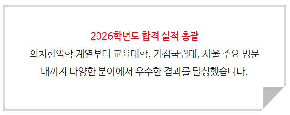 안녕하세요, 루멘&아이비&그라티아입니다. 2026학년도 대학입시가 마무리되었습니다. 우리 학원 학생들이 보여준 놀라운 성과를 여러분과 함께 나누고자 합니다. 치열했던 입시 레이스 속에서 최선을 다한 모든 학생들에게 진심으로 축하와 격려의 박수를 보냅니다. 2026학년도 합격 실적 총괄 의치한약학 계열부터 교육대학, 거점국립대, 서울 주요 명문대까지 다양한 분야에서 우수한 결과를 달성했습니다. "대한민국 입시의 최정점, 서울대 의예과" 및 의치한약학 계열 - 8건의 압도적 성과 의학계열 완벽 석권 서울대 의예과 - 학성고 김ㅇ원 울산대 의예과 - 학성고 김ㅇ원 가천대 의예과 - 학성고 김ㅇ원 국립강릉원주대....... <img src="https://blogthumb.pstatic.net/MjAyNjAyMDhfNyAg/MDAxNzcwNDc5MDYxNjk4.Bys3HLfQeO4MAyJVIhZiXyIcIBVqiYXCFnyplK8lAS4g.pLI7odXEGh8wV0LueVP_6OtulNoXj3DLS8NkSbqh2mgg.PNG/image.png?type=s3" />