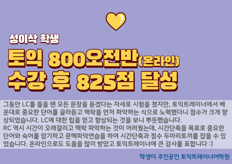 오늘은 토익트레이너에서 꾸준한 수업 참여와 유형별 문제풀이 방식에 대한 학습을 통해 목표점수에 도달한 성이삭 학생의 후기를 알아보아요~! 1. 800반 LC 후기 그동안 LC를 들을 땐 그냥 모든 문장을 듣겠다는 자세로 시험을 쳐왔는데, 중요한 단어만 골라듣고 맥락 파악만 하는 식으로 노력을 했더니 듣기 점수가 크게 향상이 되는 것이 보였습니다. 처음에는 100문제 중에 20~30문제가 틀리더니, 나중엔 거의 3~4문제 정도 틀리더군요. 물론 시험장과 같은 조건 하에서 100문제를 풀어본 건 아니었지만, 어쨌든 LC에 대한 팁을 얻고 향상되는 것을 보니 뿌듯했습니다! 2. 800반 RC 후기 RC 역시 모든 문장을 읽으려고 하니 시간만 오래걸리....... <img src="https://blogthumb.pstatic.net/MjAyNjAyMDVfMzAw/MDAxNzcwMjg2OTMyNTg1.9e6-XqzPMIZosfH312oXyDjkRbYzGGlnDlEcSW8MYOcg.VDK7fx6Z4Lc1w-d8PLApUOQHk6TyGXKXra-YmCnvyXcg.PNG/%BC%BA%C0%CC%BB%E8.png?type=s3" />