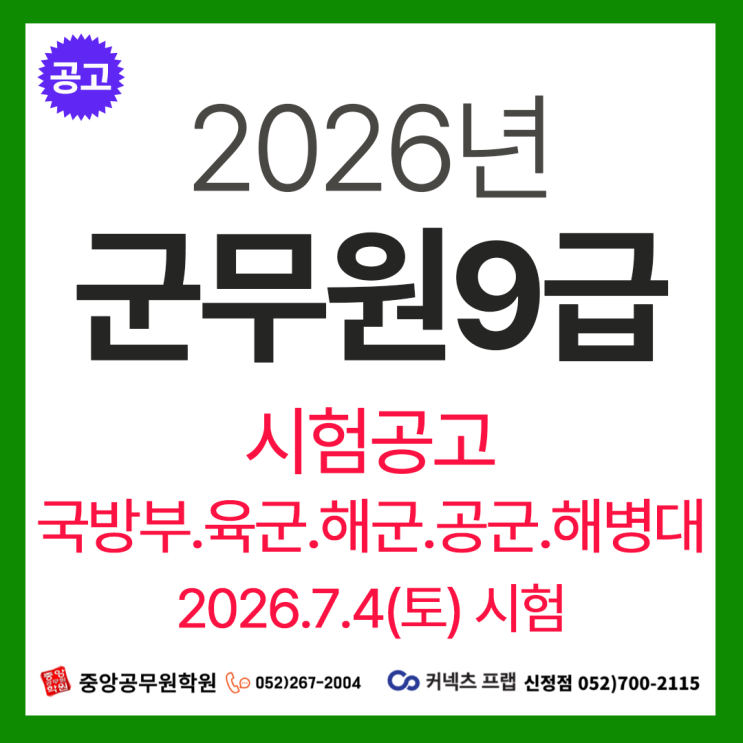 [시험공고] 일반군무원 공채 시험계획 (국방부.육군.공군.해군.해병대) [울산중앙공무원학원][울산공무원학원]