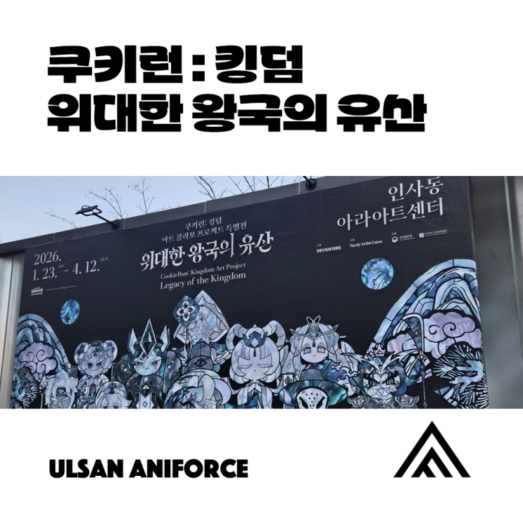 안녕하세요! DREAMS COME TRUE! 꿈이 이루어지는 공간. 울산 애니포스 만화학원입니다! (캐치프라이즈 외치는 시간! 빠샤!) ✊ 서울 인사동 아라아트센터에서 진행 중인 쿠키런 전시회에 다녀왔어요! 바로 [쿠키런: 킹덤 아트 콜라보 프로젝트 - 위대한 왕국의 유산] 이라는 이름으로 진행되고 있는 전시인데요! 쿠키런 전시회 더 알아보기 https://booking.naver.com/booking/12/bizes/1569215 기간 26.01.23(금) - 26.05.17(일) 장소 아라아트센터 관심 있으셨던 분들이라면 한 번쯤 눈여겨보셨을 전시죠? 쿠키런과 한국 전통 무형유산의 만남 이번 인사동 쿠키런 전시회는 단순한 캐릭터 전시가 아니었다는 점! ....... <img src="https://blogthumb.pstatic.net/MjAyNjA0MDRfMjk5/MDAxNzc1Mjc3MTUwNzgy.kRLKbevpSvljcgXM09sWzfjSyjR5OJ_fYZ_AtBRtpKsg.qNDdzFbiH22Exw8MdmDAHl22CMaTeX-08qnBVt22BRog.PNG/%C4%ED%C5%B0%B7%B1%C5%B7%B4%FD_%C0%FC%BD%C3%C8%B8.png?type=s3" />