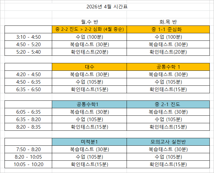 26년 4월 시간표 안내