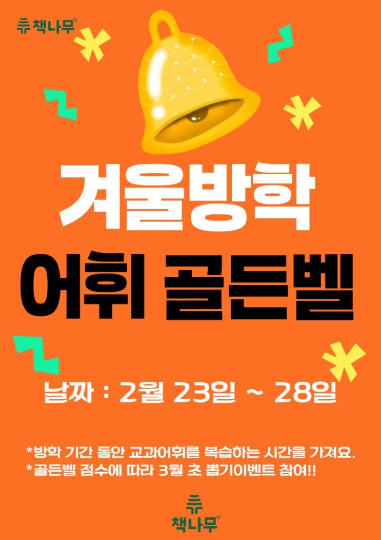 겨울방학 어휘 골든벨 안내 겨울방학 동안 꾸준히 진행해 온 어휘 학습의 마무리 활동으로 책나무에서는 어휘 골든벨 시험을 진행합니다. 이번 어휘 골든벨은 단순한 시험이 아니라, 방학 동안 익힌 어휘를 정리·점검하고 아이들이 스스로의 성장을 느낄 수 있도록 돕기 위한 활동입니다. 시험 기간 안내 2월 23일(금) ~ 28일(수) 개인 수업 일정에 따라 시험날짜가 달라집니다. 이벤트 안내 시험 결과에 따라 뽑기 이벤트가 함께 진행됩니다. 어휘 공부를 통해 얻은 노력의 결과를 작은 보상과 성취감으로 연결하고자 준비한 활동입니다. (이번 어휘골든벨 상품에는 '두쫀쿠'가 있어요~!) 점수 자체보다는 얼마나....... <img src="https://blogthumb.pstatic.net/MjAyNjAyMDdfMjI3/MDAxNzcwNDQyODIxMjUy.VNTcLjs2I4ZqZlblE4ZAbhVayydTuwEDlzNsxitP6qsg.2dJou_gSCozGJbHzpZj53t26mgsXQUIGlxZO_sAIwN0g.JPEG/%C1%A6%B8%F1%C0%BB_%C0%D4%B7%C2%C7%D8%C1%D6%BC%BC%BF%E4._%281%29.jpg?type=s3" />