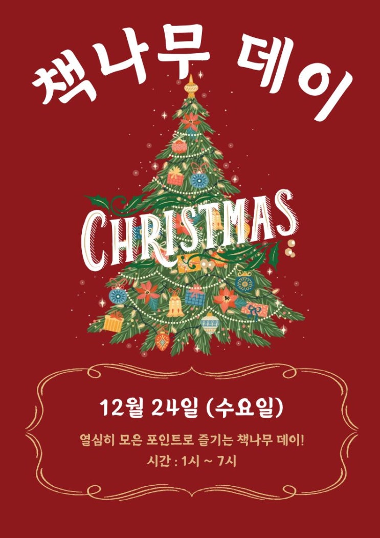 2024 책나무데이 – 크리스마스 특별행사 안내 12월 24일, 책나무의 연말 전통인 책나무데이가 돌아옵니다! 책나무데이는 1년 동안 수업과 독서 활동을 열심히 해온 아이들을 위해 준비하는 보상·체험·놀이가 함께하는 특별한 날이에요. 책나무데이, 어떤 행사인가요? 책나무데이는 아이들이 수업 시간에 차곡차곡 모아온 ‘칭찬 포인트(사인)’를 사용해 작은 마켓데이처럼 운영되는 행사입니다. 아이들은 스스로 포인트를 계산하며 원하는 아이템을 선택하고 구매하며 주도성과 선택의 즐거움을 경험하게 됩니다. 올해 책나무데이에서는 아래 활동들을 즐길 수 있어요! 1. 마켓데이 – 포인트로 쇼핑하기 아이들이 좋아하는 ●....... <img src="https://blogthumb.pstatic.net/MjAyNTEyMTJfMjcw/MDAxNzY1NTIwNzQ4NTU2.SX4pJFCzmnttf-JPQnZQQFinE8CpYKj289FhthuG8zcg.gpyoB3rHqZXALjNQ_T08Qv8OqP-coglCXNo3InNTZlIg.JPEG/1.jpg?type=s3" />