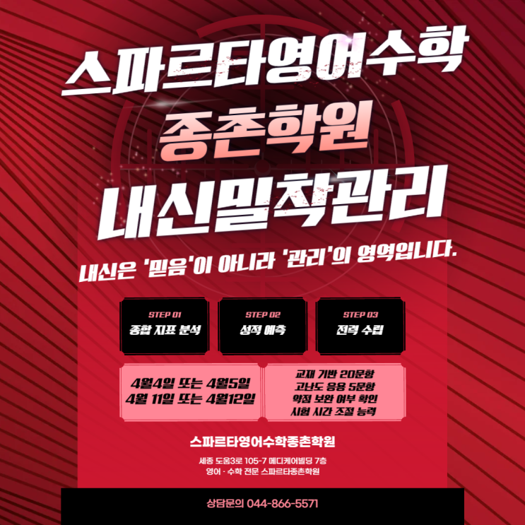 4월 중등부 수학 내신, 확실한 ‘데이터’로 준비합니다 내신은 ‘관리’의 영역입니다. 작은 빈틈까지 꼼꼼하게 체크하는 과정이 없다면 노력만큼의 결과로 이어지기 어렵습니다. 그래서 세종 종촌동 스파르타 영어수학 종촌학원에서는 중등부 학생들의 실력을 두 번에 걸쳐 점검하는 [1·2회차 내신 실전 대비 테스트]를 진행합니다. 단순히 시험만 보는 것이 아니라 결과 분석부터 보완까지 이어지는 체계적인 관리 과정을 함께 안내드립니다 STEP 1. 1차 실전 대비 Test 실전과 유사한 문항 구성으로 현재 실력을 객관적으로 확인합니다. • 일정 4월 4일(토) 또는 4월 5일(일) • 내용 교재 기반 20문항 고난도 응용 5문항 ?....... <img src="https://blogthumb.pstatic.net/MjAyNjA0MDJfMTAy/MDAxNzc1MTExNDI3OTM3.iAYoFIuz3NOuRALG0d7QA3nsIqCTve0GxO5k6g5xYjwg.9N_oGqWrO9yOmpRCRay4CKOpvhYJDDthWwy4FSdHSpAg.PNG/image.png?type=s3" />