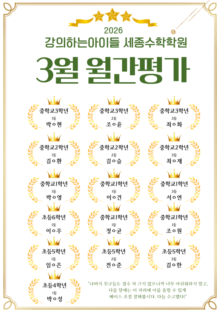 [세종시 고운동 수학학원] 3월 수학 월간평가 성적 우수자 명단: 우리 아이가 1등? 성취도가 쑥쑥!