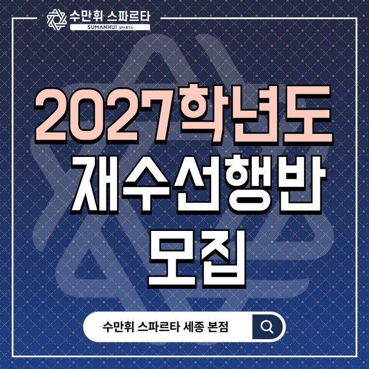 안녕하세요. 목표가 현실이 되는 공간 수만휘 스파르타 세종본점입니다. 2027학년도 재수, 먼저 시작하는 자가 끝까지 갑니다 수만휘 스파르타 2027 재수 선행반 모집 재수의 성패는 **‘언제 시작하느냐’**에서 갈립니다. 수능이 끝났다고, 결과를 기다린다고 시간이 멈춰주지는 않기 때문입니다. 그래서 수만휘 스파르타 세종본점은 2027학년도 재수 선행반을 통해 가장 먼저, 가장 체계적으로 준비할 수 있는 길을 엽니다. Start Early, Win Surely 먼저 시작하는 자, 합격을 잡는다. ✔ 이런 학생에게 추천합니다 N수생으로, 재수를 결심했거나 고민 중인 학생 학습 습관부터 다시 제대로 잡고 싶은 학생 혼자서는 계획·관리·실행이 어려웠....... <img src="https://blogthumb.pstatic.net/MjAyNTEyMTNfMjgg/MDAxNzY1NTk2ODgyMTc2.Ube036dsYaPw1QFlQ_ObZL6FYc25wy0vXHrVKXhvZ-8g.F0DCisKLQYPb3FkqzTlaJkRQUcppRe42_P6hr3elYykg.JPEG/%C0%E7%BC%F6%BC%B1%C7%E0.jpg?type=s3" />
