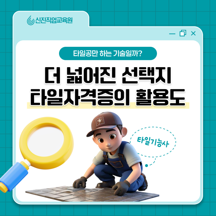“타일은 타일공만 하는 거 아닌가요?” “한 번 배우면 그 일만 계속해야 하는 기술 아닌가요?” ※ 혹시 이렇게 생각하셨다면 오늘 글 꼭 주목해 주시길 바랍니다. 안녕하세요. 타일기술전문학원 신진직업교육원입니다. 실제로 타일을 처음 접하는 많은 입문자분들께서 타일기능사 준비 전부터 위와 같은 고민을 먼저 하시는 경우가 참 많습니다. 하지만 결론부터 말씀드리면, 타일은 결코 한 가지 작업에만 머무는 기술이 아닙니다. 같은 현장 안에서도 맡는 역할이 달라지고, 작업의 범위가 넓어지면서 대우와 포지션 자체가 달라지는 경우도 발생하는데요. 오늘은 타일기능사 이후 왜 선택지가 넓어지는지, 그리고 그 차이가 어디서 만들어....... <img src="https://blogthumb.pstatic.net/MjAyNjAxMTJfMjM4/MDAxNzY4MTkwMDc0OTcz.E6a_zzhPqH2dQWCGtvejkOSkxjETzjUQeY0gQnM_WnEg.Mg2t_j8UzRJmyZ4TeEEOseZwn-0Td7zjGp0r8T5K4-kg.PNG/%C5%B8%C0%CF%28%B3%B2%C4%B3%29_%282%29.png?type=s3" />