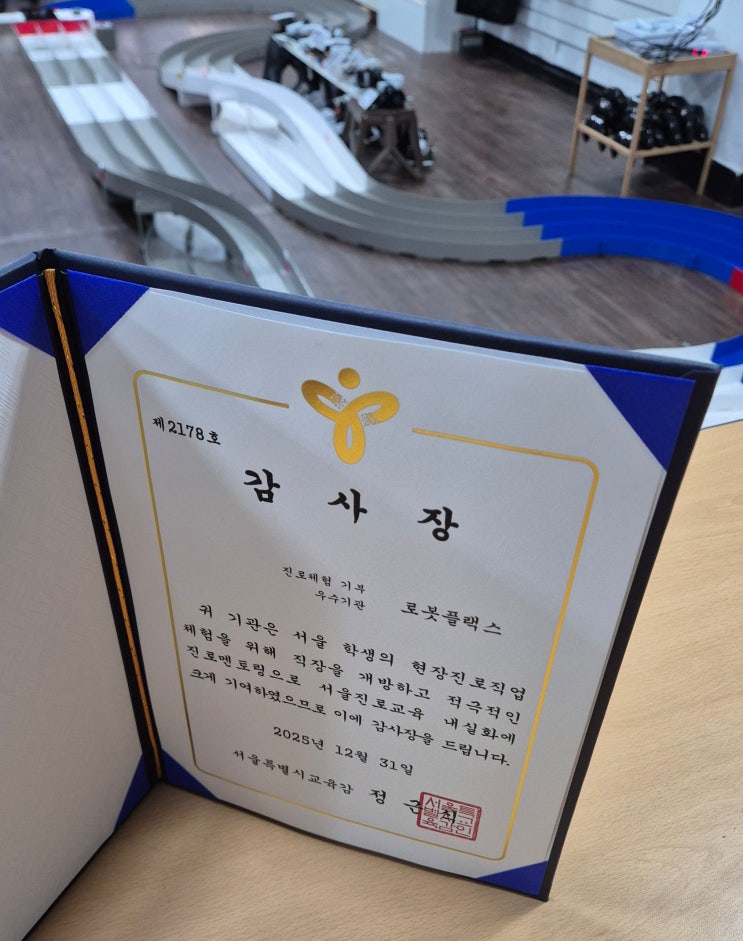 얼마 전 로봇플렉스가 서울시 교육감으로부터 감사장을 받았습니다. 아이들과 함께한 교육 활동이 공공 교육의 가치로 인정받았다는 점에서 무엇보다 뜻깊은 순간이었습니다. 그동안 로봇플렉스가 지켜온 "아이 중심의 교육" & "창작과 도전을 응원하는 교육" 철학에 대한 응답이라고 생각합니다. 학생들 , 그리고 학부모님 덕분입니다. 이 자리를 빌려 항상 믿고 맡겨주시는 학부모님, 그리고 매 수업때마다 진지하게 도전해 주는 로봇플렉스 학생들에게 진심으로 감사의 마음을 전합니다. 학생들이 만들어낸 작은 성취들이 모여 이렇게 큰 응원이 되어 돌아왔다는 생각이 듭니다. 앞으로도 변함없이 더 단단하게 아이....... <img src="https://blogthumb.pstatic.net/MjAyNjAxMTNfMyAg/MDAxNzY4Mjg3MDAyNTg5.83dgeNmXu9boXdc6s6q9RowbK_nJ0jrhXdbXaOREC_gg.Tpd1jkUpM7qtt2UR1LekFwrKjF46K2QlX-imAF3N9KUg.JPEG/KakaoTalk_20260113_151255667.jpg?type=s3" />
