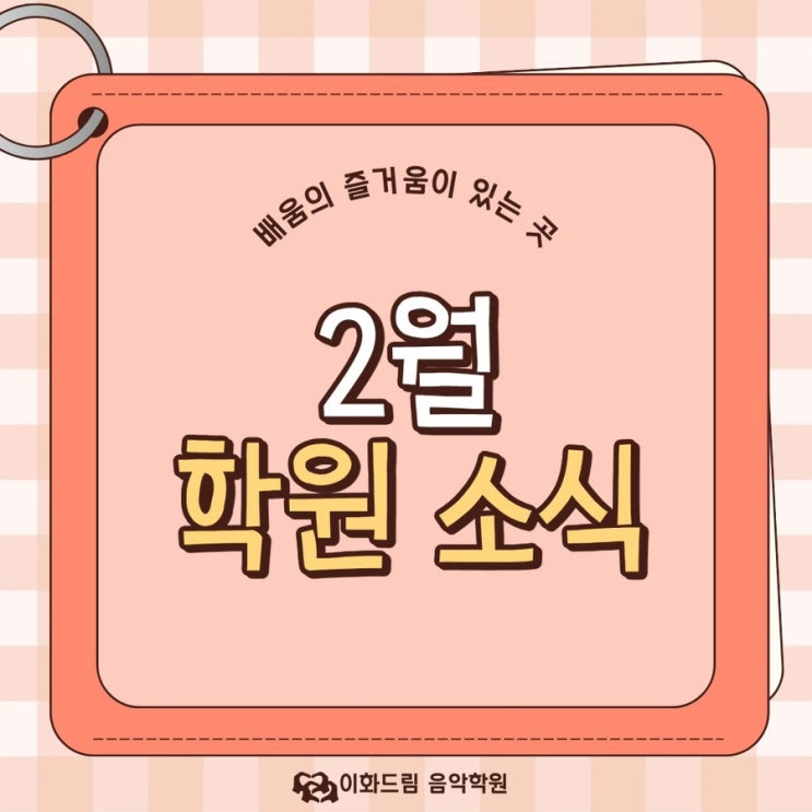 안녕하세요:) 배움의 즐거움이 있는 곳! 이화 드림 음악학원 입니다~ 어느덧 새 학기를 준비하는 2월이 찾아왔습니다. 새로운 시작을 앞둔 우리 아이들이 2월 한 달도 즐겁게 피아노를 치며 지낼 수 있도록 다양한 수업이 준비되어 있습니다. 2월 학원 소식 및 일정 안내드립니다 2월 학원 일정 2월 학원 일정 2월 16일(월)-2월 18일(수) 설날 휴원 2월 24일(화) 음악 윷놀이 특강일 2월 공지사항 1) 설날 연휴 보강 수업 안내 설날 연휴로 인해 수업 횟수가 부족한 학생들은 2월 중으로 꼭 보강 수업을 신청해 주세요. 보강은 해당 월에 가능합니다. 2) 새 학기 시간표 변경 안내 새 학기를 맞아 기존 레슨 시간 조정이 필요한 경우 원활한....... <img src="https://blogthumb.pstatic.net/MjAyNjAyMDJfMTkg/MDAxNzcwMDIyNzk4NDA1.dLaRHSjwIefnr3Zn32PIziJkRRjxzUU3yvDmP84oPqgg.t02tTNAqsjYIovsMoCHgSS_Myd3-XVx9YCmEBDOvm_kg.JPEG/IMG%A3%DF8491.JPG?type=s3" />
