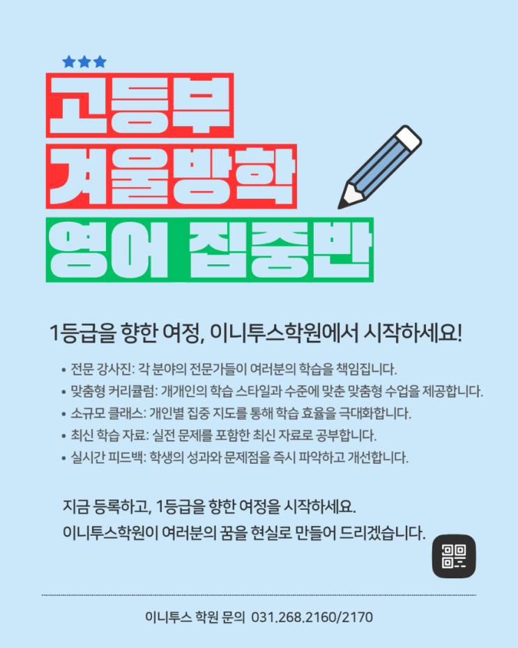 수원정자동영어학원- 고등부 영어 겨울방학특강 수업 국어.영어.수학.과학 단과학원 이니투스 고등영어는 주중반. 주말반으로 2시간씩 2번~3번 진행되고 최대인원 10명을 기준으로 판서수업 후 학생 한명 한명 개별지도를 하고 있습니다 # 예비 고1 # “첫 시험(내신)부터 입시의 실전이라는 것을 잊지 말 것!” ■ 겨울방학 ~ 2월을 최대한 활용하여 철저한 기본기를 다질 것 1. 어휘 : 중등 2500 완전 정복(선택) + 고등 3000 Scanning & N회독 2. 문법, 구문 : 기계적 독해를 위한 문장 구조론 습득에 초점 3. 독해 : 공부하는 어휘 수준에 맞는 독해교재 선정 감각 익히기에 주력 4. 듣기 : 고1 듣기 모의고사를 매일 1회분 씩 듣고 틀린....... <img src="https://blogthumb.pstatic.net/MjAyNTEyMTdfOTQg/MDAxNzY1OTAxNTgzNjc0.T2T3QHa5OhDoto1jfTEalrAk2KicMMDcYk_oXsAD1hgg._9Vfw_4kOelw3WG-zIR7jnHda-qjlVSnIOkQKYxeH0wg.PNG/900%A3%DF%B0%ED%B5%EE%BA%CE_%B0%DC%BF%EF%B9%E6%C7%D0%A3%DF20251216%A3%DF104110%A3%DF0000.png?type=s3" />