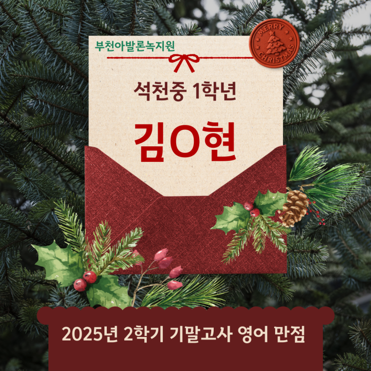 부천 녹지원 2025년 2학기 기말고사 영어 성적우수자 "시험 보느라 정말 고생 많았어! 결과보다 중요한 건 네가 그동안 단어 하나하나 외우며 쏟았던 정성과 노력이야. 그동안 고생한 네 자신을 듬뿍 칭찬해주자!" "100점이 아니라고 해서 네 노력이 사라지는 건 아니야. 이번에 틀린 문제는 네가 앞으로 더 완벽해지기 위해 잠시 찾아온 '배움의 기회'일 뿐이거든. 점수라는 숫자보다 휠씬 값진 건 끝까지 포기하지 않는 네 마음이야~ 정말 기특하고 고생 많았어!" 고생했다❤️ 한해동안 열심히 공부한 부천 녹지원 중등관 학생들을 위한 간식이벤트~ 기대해주세요! 새학년, 새학기, 힘찬 시작을 기대해~ 겨....... <img src="https://blogthumb.pstatic.net/MjAyNTEyMThfMTI1/MDAxNzY2MDQyMTM5OTcw.tB-a24Plf9nWM7QX0Znr6kWfMEyArI1ZvwAAPyVCG80g.p8vwTvkske9J2atDoSwAevVimw0u4hxc8wiAAwqdmpkg.PNG/001.png?type=s3" />