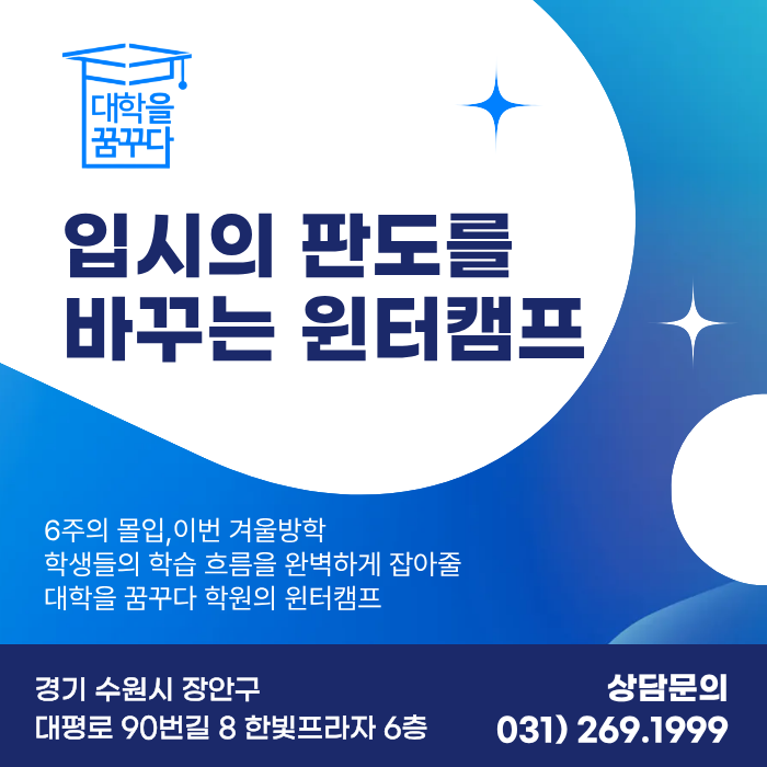 빠르게 변화하는 입시제도, 1-2점 차이로 좌우되는 대학입시! "대학을 꿈꾸다 학원"에서 상담 받고 꿈꾸는 대학에 진학하세요! 차가운 겨울 공기가 느껴지는 요즘, 학생들의 성장을 위해 가장 뜨거운 시간을 준비했습니다. 이번 겨울방학, 학생들의 학습 흐름을 완벽하게 잡아줄 대학을 꿈꾸다 학원의 윈터캠프 소식을 상세히 전해드려요. 6주의 완벽한 루틴, 수원에서 누리는 기숙 학원급 몰입 환경 대학을 꿈꾸다 학원의 윈터캠프는 1월 12일부터 2월 28일까지 진행되며(설 연휴 제외), 학생들의 학습 밀도를 극대화하는 긴 호흡의 루틴으로 설계되었습니다. 학습 루틴 월~금 오전 8시 40분 등원 후 밤 10시까지 정규 수업과 자기주....... <img src="https://blogthumb.pstatic.net/MjAyNTEyMjlfOTQg/MDAxNzY2OTc0NTQ2MTQ4.dXvEtb9NADcHSG1nZWOhGIQkFv4dISpwRWMoGLQMrqsg.pcXqpPCLBGdZEiOOtqNq9pOS06u-LiMp3UmBU1qvyNsg.PNG/%B9%E9%BC%B3%B8%B6%C0%BB_%B5%CE%B0%DF%B8%B6%C0%BB_%BF%AC%B2%C9%B8%B6%C0%BB_%B0%DC%BF%EF%B9%E6%C7%D0%C7%D0%BF%F8_%281%29.png?type=s3" />