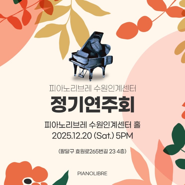 안녕하세요! 음악과 사람이 있는 곳, 피아노리브레 입니다 오늘은 정기연주회 소식 입니다☺️ 투 피아노로 빚어내는 콘체르토, 포핸즈, 쇼팽–리스트–스크리아빈으로 이어지는 낭만 계보, 색다른 매력의 20세기 미국 현대음악, 그리고 키스 자렛, 카푸스틴의 재즈풍 레퍼토리까지‼️ 다양한 매력을 한 무대에서 즐기실 수 있어요❤️ 연주 후에는 뒤풀이 파티도 준비되어 있어요 따뜻한 연말, 함께해요! 2025년 12월 20일 (토) ⏰ 오후 5시 피아노리브레 수원인계센터 홀 수원인계동피아노학원 수원보컬학원 피아노리브레 수원인계센터 상담문의 ▶ 전화 010-2271-9915 ▶ 카톡 pianolibre9 ▶ 인스타 pianolib....... <img src="https://blogthumb.pstatic.net/MjAyNTEyMTFfMzEg/MDAxNzY1NDQwNDc0NTE0.5Gb2EHZM9nOTAfFccZUr3IrCzIdWQ00QhwVBnOox8H4g.Zw5VYB5pvEC_Jo0nqfrqL_mlu3QaqbyrehKFiA2g4Ysg.JPEG/IMG%A3%DF5545.jpg?type=s3" />