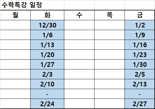 안녕하세요. 엠베스트SE 우만캠입니다 수학영어 재원생 2026겨울방학 특강 안내드립니다. 엠베스트SE 수학 8주 몰입특강 안내 겨울방학 기간 재원생들의 실력향상을 위한 8주간의 수학특강수업을 운영합니다. 각자의 수준에 맞추되 학생 개개인마다 가능한 최대한의 학습을 보장하여, 스스로 실력향상을 경험하게 하는 것이 목표입니다. 학부모님, 학생들은 아래의 내용을 참고하시어 희망여부 회신해주시면 감사드리겠습니다. ● 기간 : 12월~2월 (8주) 아래의 시간표 참고 ● 시간 : 화요일 3시간 / 금요일 1시간 ● 교습비 : 중등 월18만원 / 초등 월15만 ● 내용 : 다음학기 혹은 다음년도 진도 (개인별 진도) 시간 안맞을시 개별보충 가....... <img src="https://blogthumb.pstatic.net/MjAyNTEyMThfMTMy/MDAxNzY2MDM4NzA1MTI0.muHaS6JbubX2YMsq5F26ltV-jt5Q2LcIabjdjA5K3c0g.FKNlrHxBD-sAXj1M8HzM7hjrSMnmqyV-myC87i9zPCYg.PNG/IMG%A3%DF6891.PNG?type=s3" />